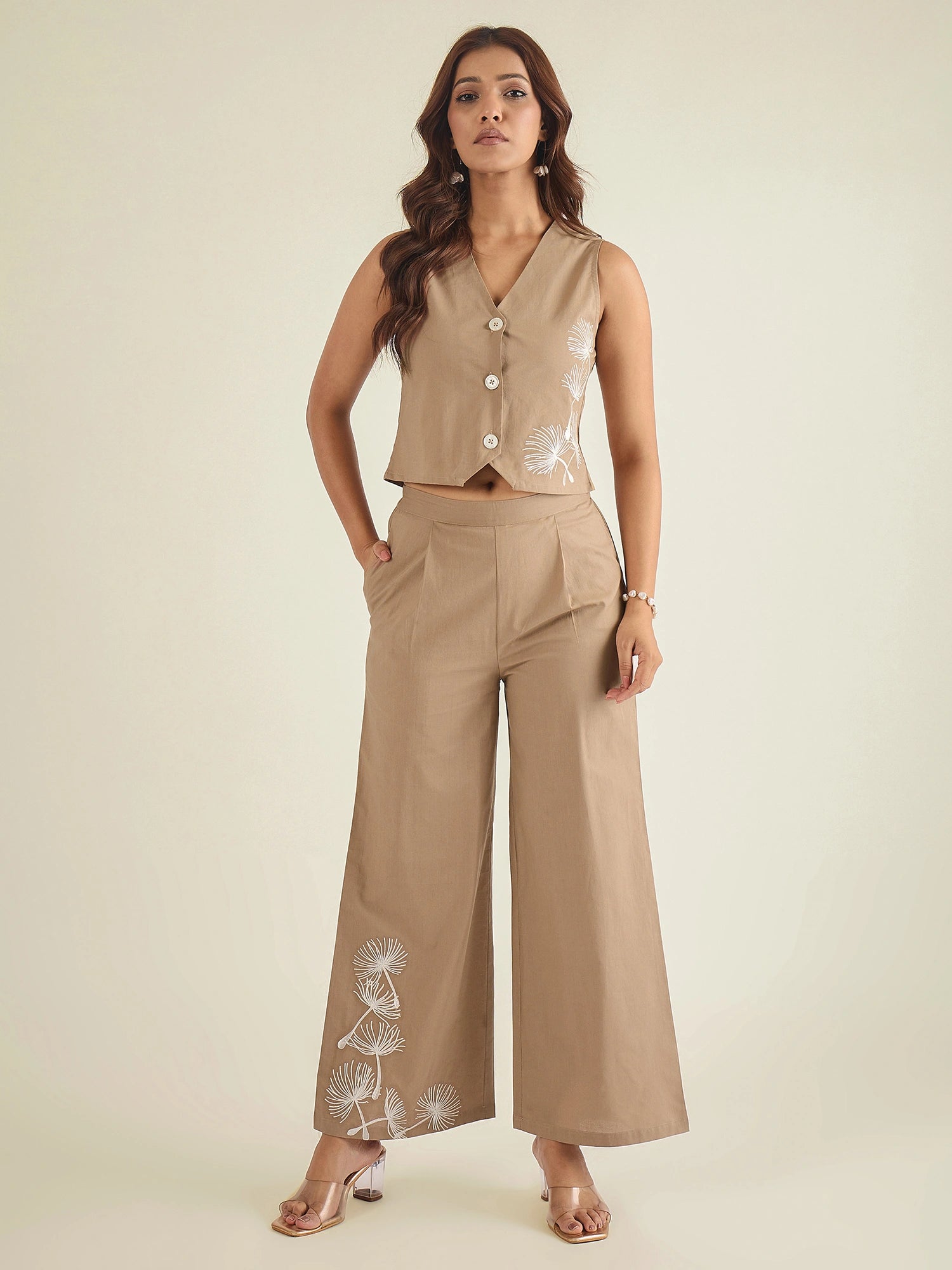 Cotton sleeveless V-neck top and flared pants with embroidery detailing.