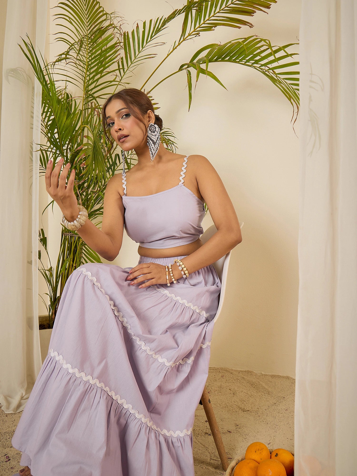 Lavender cotton co-ord set with lace strapy top , paired with a maxi skirt featuring tiered lace and an elasticated pull-on waist.