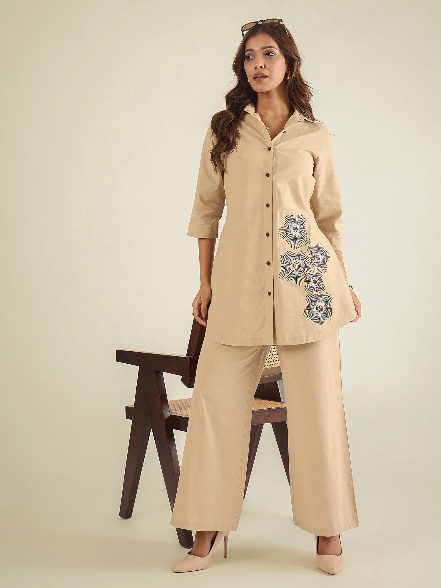 Beige cotton co-ord set featuring a relaxed-fit tunic shirt with 3/4th sleeves and front button closure, detailed with floral embroidery near the hem. Paired with wide-leg pants with an elasticated waistband and pull-on closure.