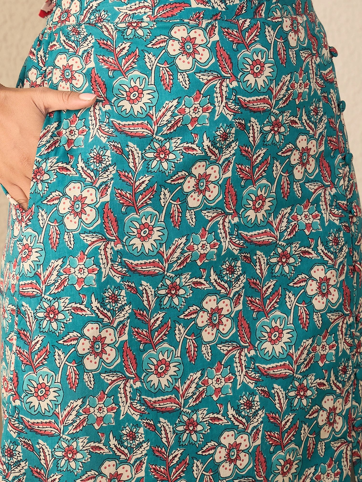 Women Blue Kalamkari Print Waistcoat with A-line Skirt