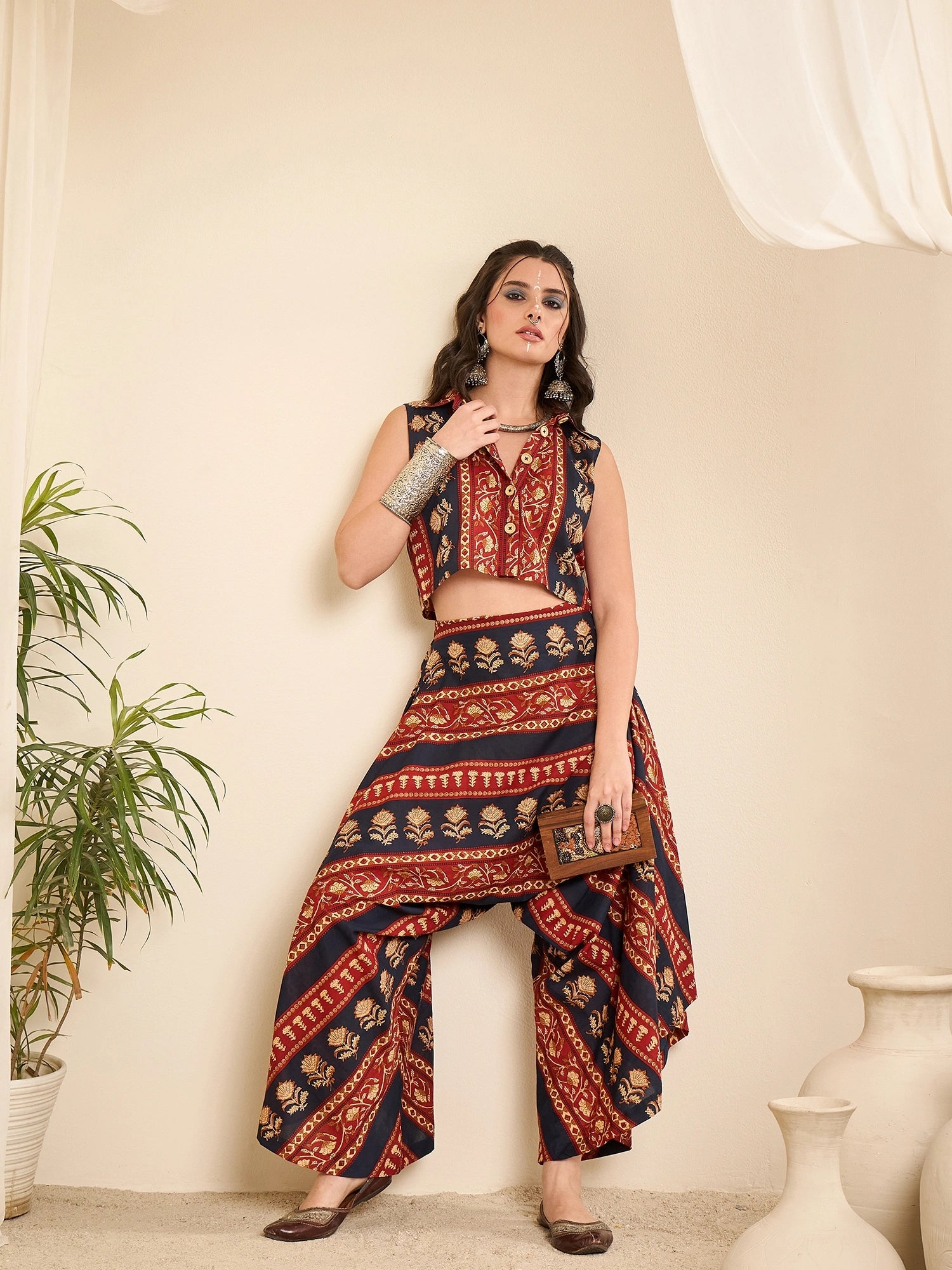 Women Bordered Crop Shirt and Harem Pant Co-Ord Set