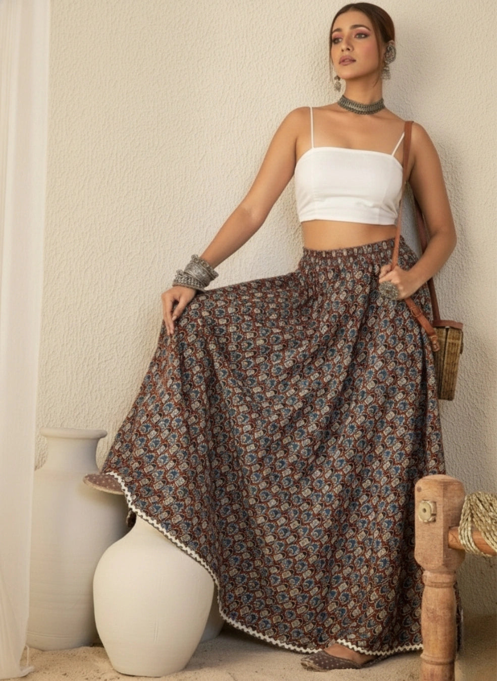Style tip: Pair this flared skirt with a solid crop top or short kurti, oxidised jewellery and kolhapuri flats for an effortlessly elegant ethnic vibe.