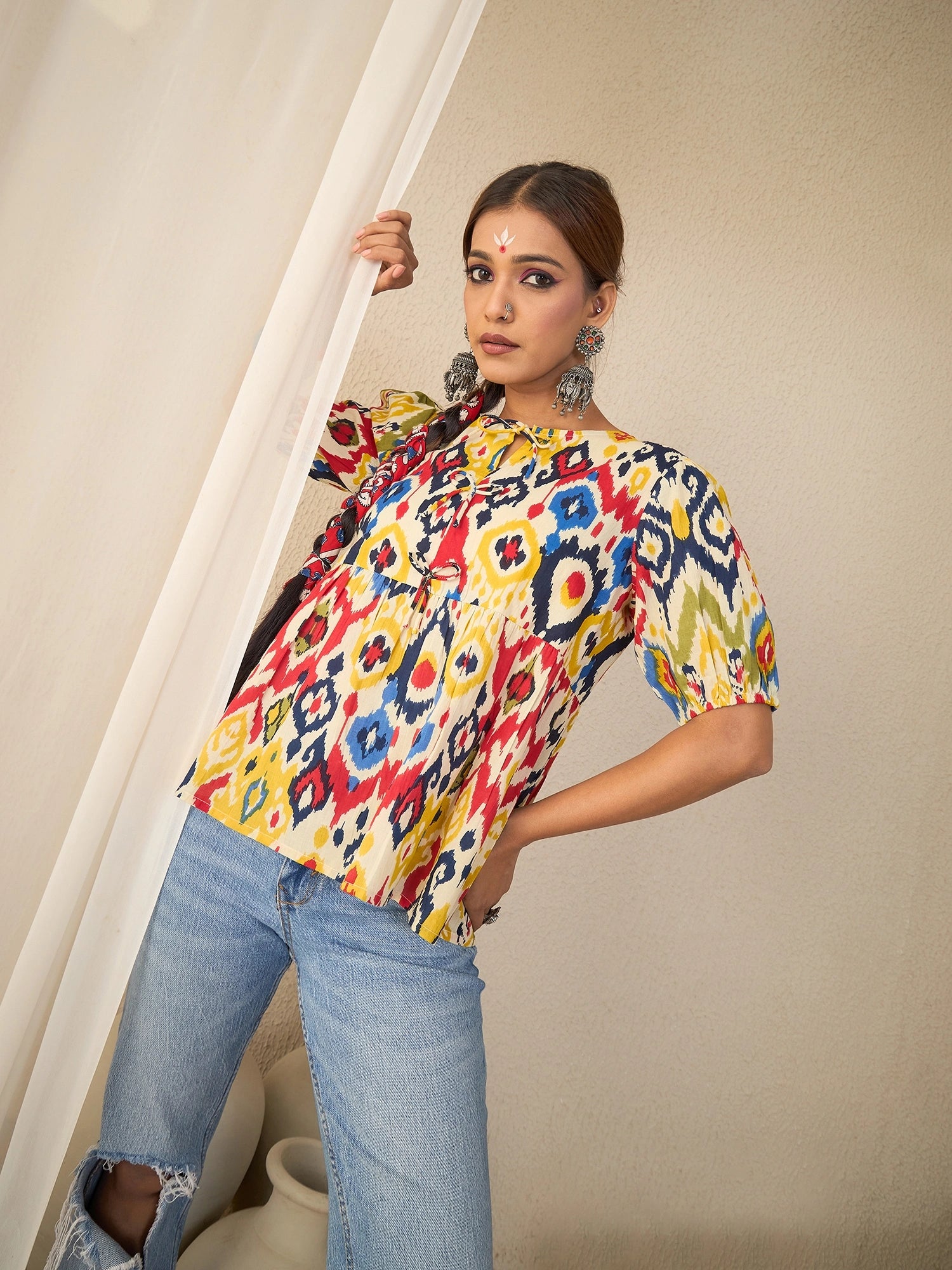 Style tips: Channel boho-chic vibes with this vibrant geometric empire waist top. Team it with high-waisted denims or linen trousers and flat sandals for a relaxed day look, or pair with slim-fit pants and block heels for an elevated evening style.