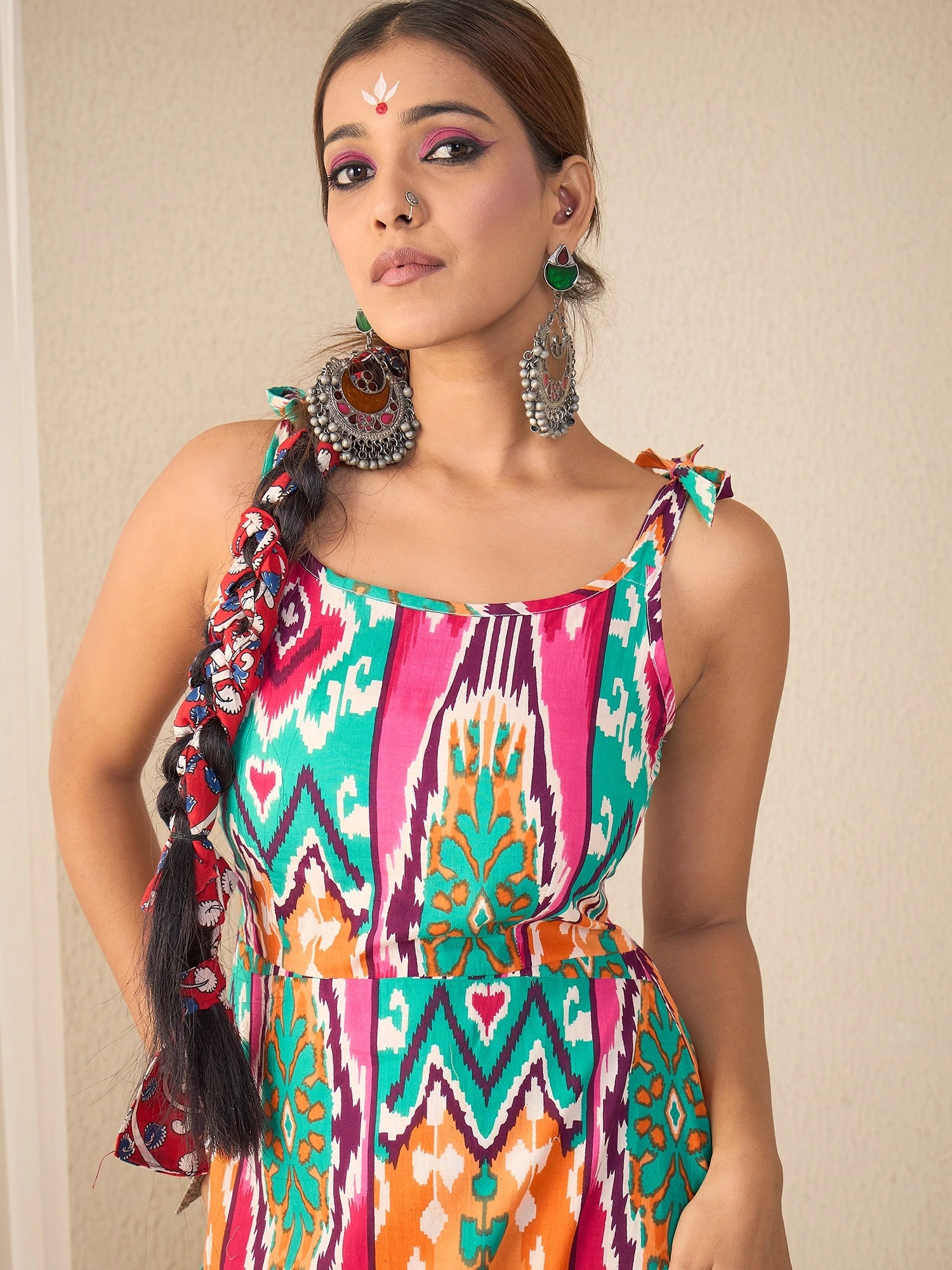 This is Shoulder Tie-up strap dress, featuring a beautiful geometric/ikat-style print, has smocking at back which define your waistline.Flounced hem gives beautiful flare to this dress.