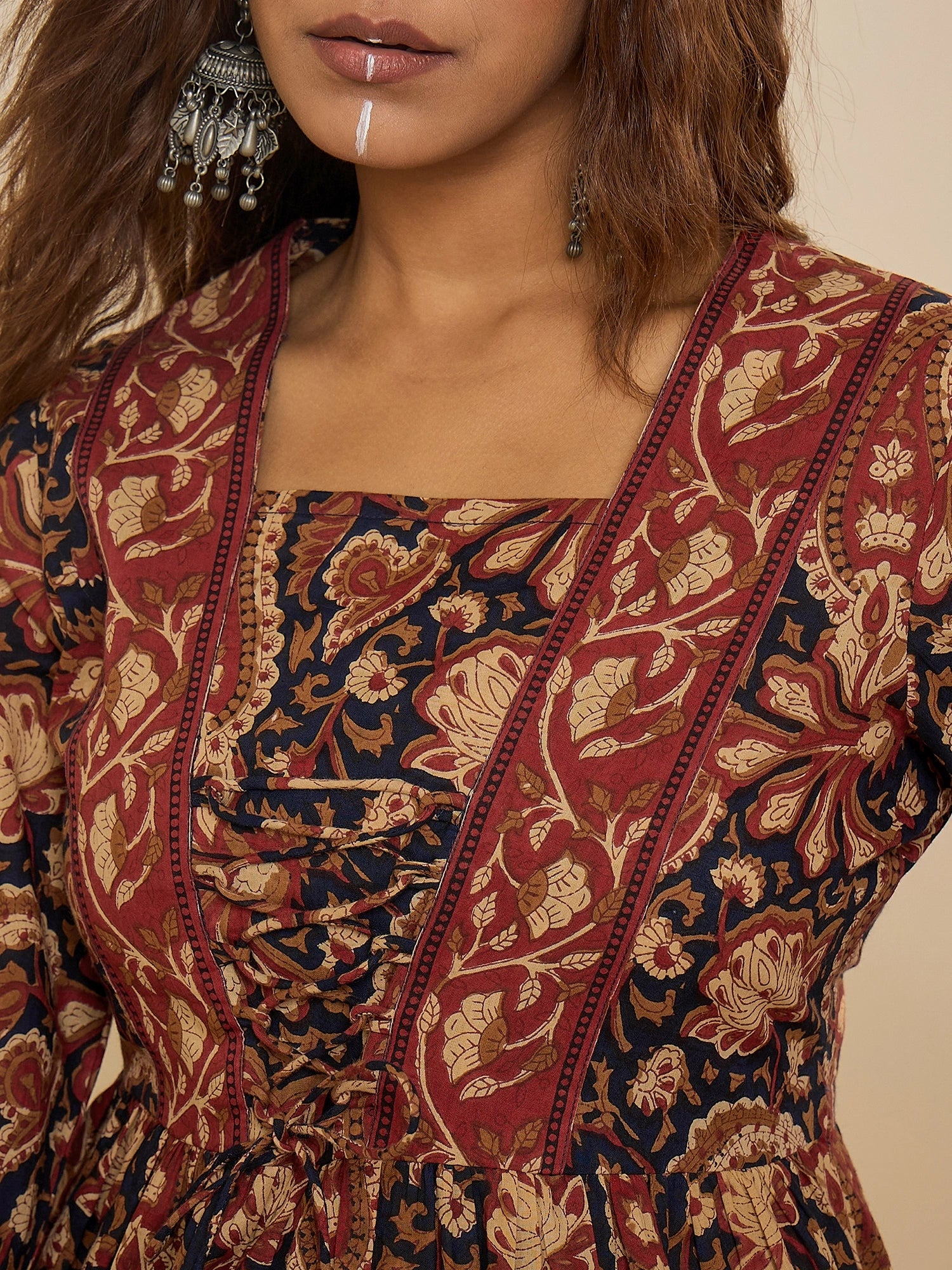 This flared top, designed in a beautiful maroon and navy palette, features a flattering empire waist, peplum-style flare, and an adjustable tie-up neckline.