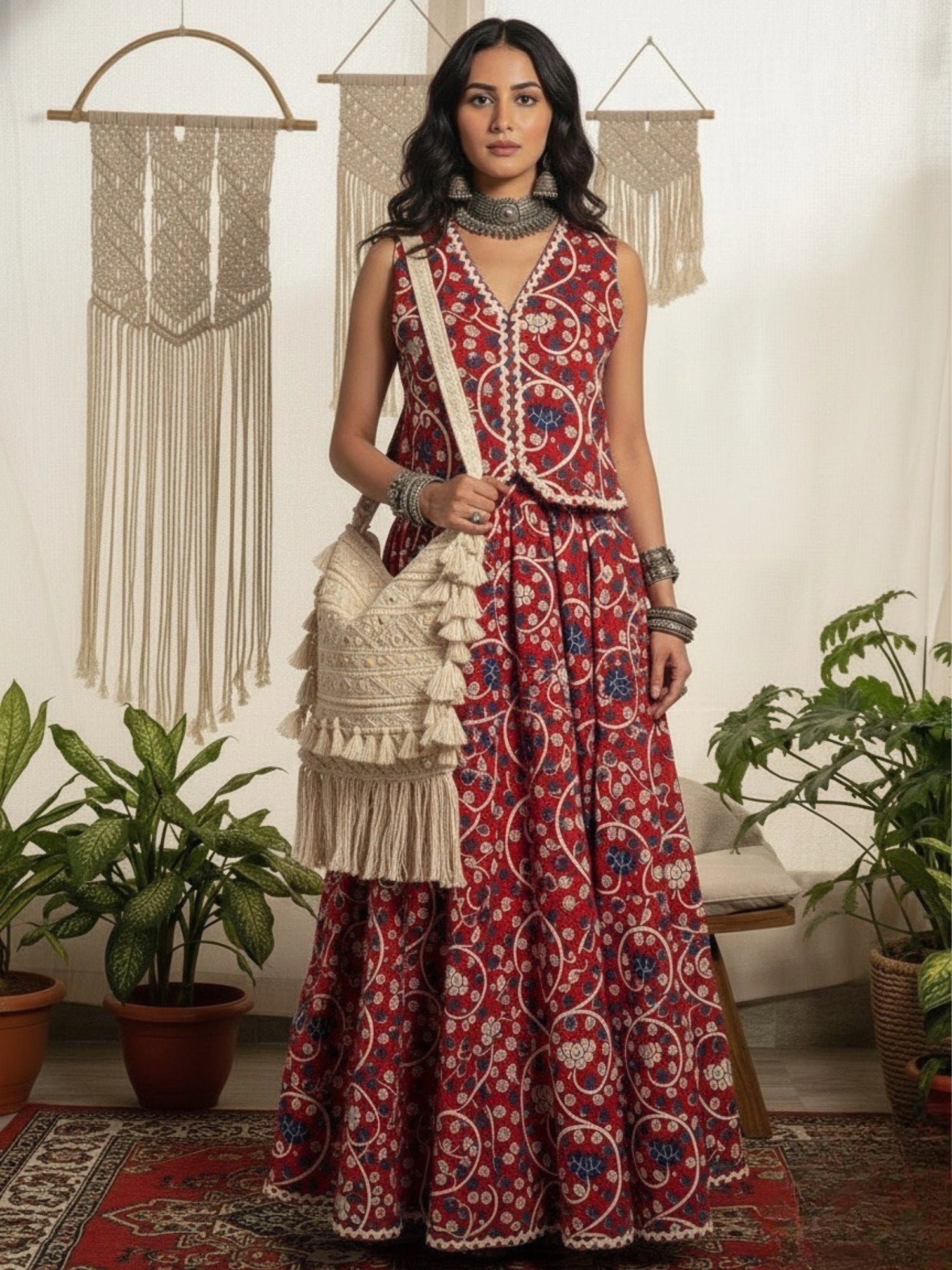 Style tips: Pair this sleeveless ethnic printed top with a matching flared skirt or high-waist palazzos. Complete the look with oxidised jewellery and flats or kolhapuri sandals for an effortless festive-casual vibe.