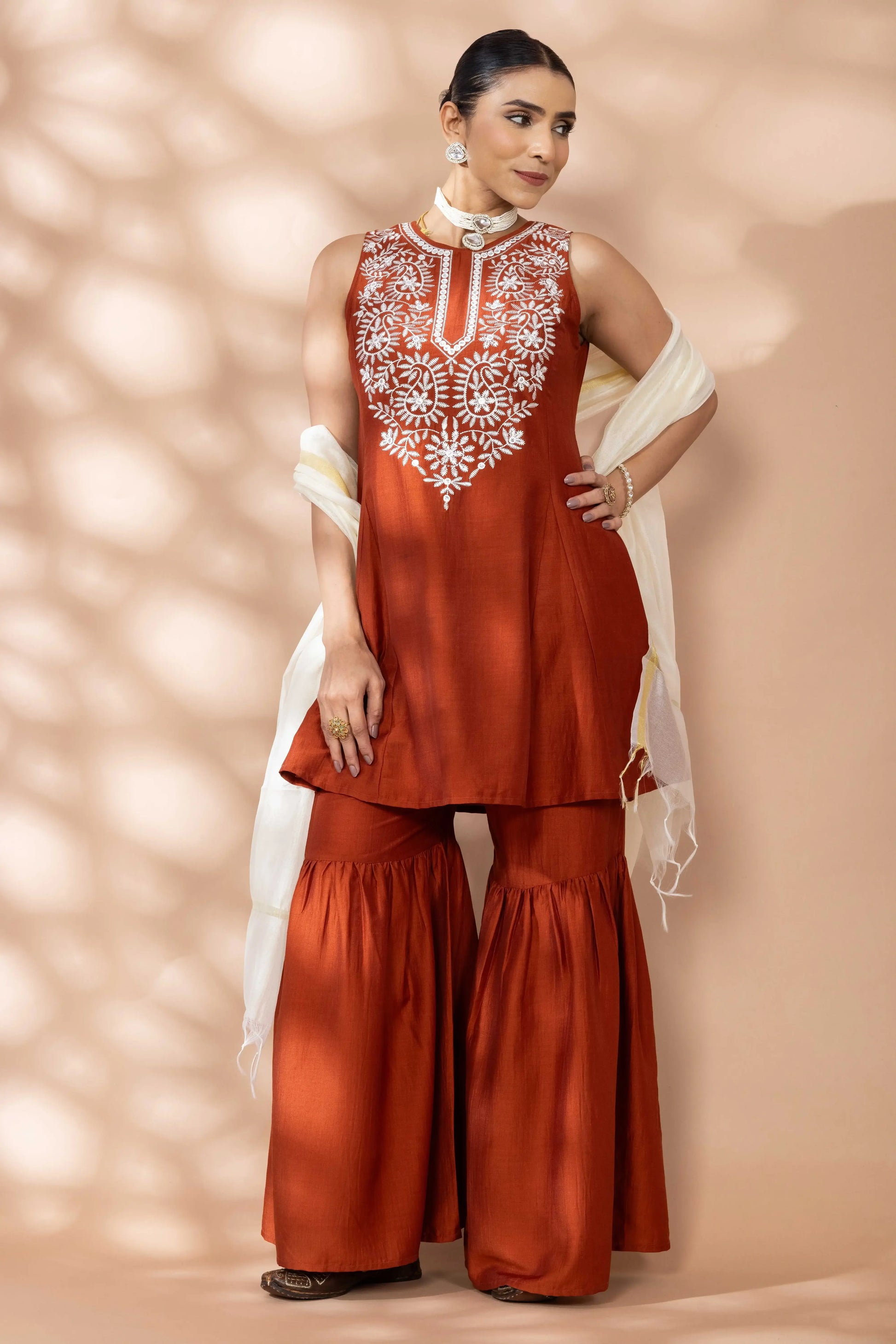Rust sleeveless kurta featuring intricate contrast embroidery on the yoke, paired with matching flared sharara pants and a white dupatta. Crafted from rich fabric for a festive-ready look.