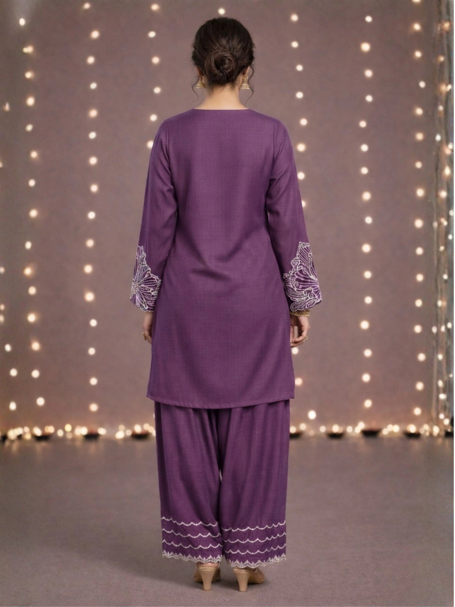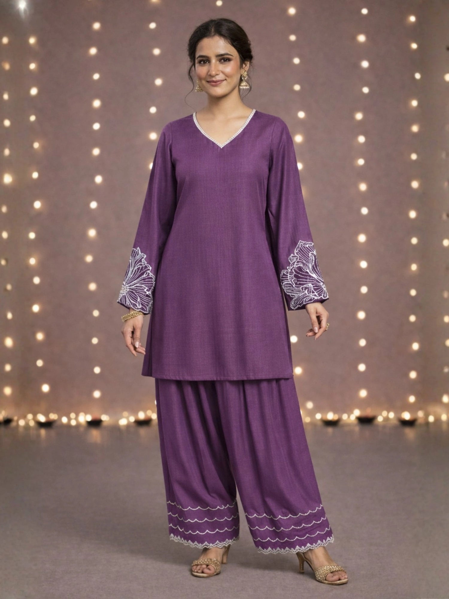 Fabric: Soft & breathable silk blend, Top: Solid purple Kurti with V-neck, bell sleeves, and embroidery at sleeve Bottom: Matching farshi salwar with scallop embroidery detailing at hem, Scarf: Coordinated scarf with delicate lace border, Sleeves: Long bell sleeves with contrast thread work, Wash Care: Hand wash recommended